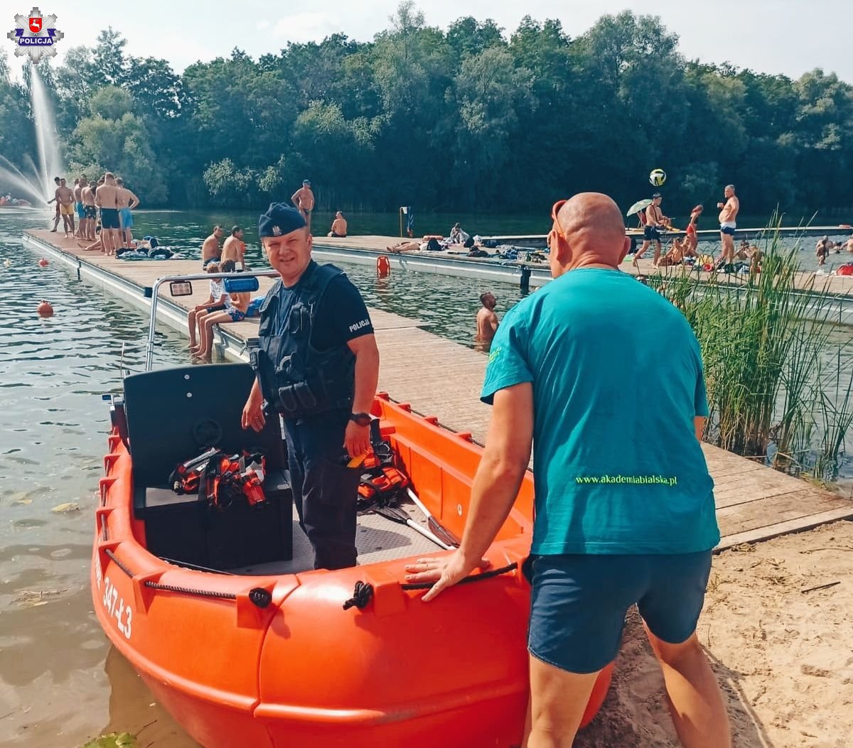 Przez cały okres wakacji wspólnie ze strażakami patrolujemy tereny akwenów. Dbając o bezpieczeństwo sprawdzamy m.in czy osoby korzystające ze sprzętu wodnego używają kapoków oraz czy są trzeźwe. Obserwujemy zachowanie osób odpoczywających na plażach i przebywających w wodzie. Podczas rozmów przypominamy podstawowe zasady bezpieczeństwa nad wodą.