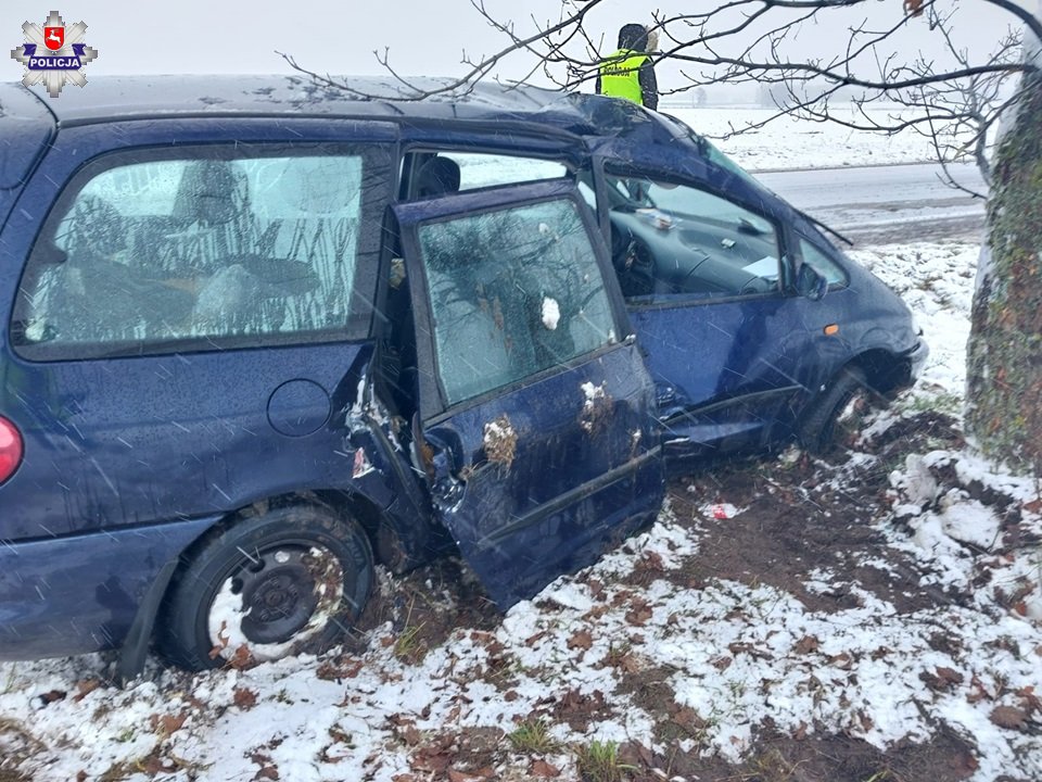W wyniku wypadku, z obrażeniami ciała do szpitala trafił pasażer samochodu. Ustalamy okoliczności wypadku. Dzisiejsza aura opady śniegu oraz mokra jezdnia nie sprzyja bezpieczeństwu na drogach. Dostosujmy technikę jazdy do warunków drogowych, nawierzchni i natężenia ruchu. Przestrzegajmy obowiązujących przepisów!
