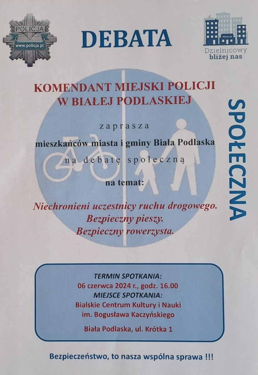 Komenda Miejska Policji w Białej Podlaskiej zaprasza na debatę społeczną z cyklu. ”Niechronieni uczestnicy ruchu drogowego. Bezpieczny pieszy. Bezpieczny rowerzysta”. Debata odbędzie się 6 czerwca br. o godz. 16:00 na sali teatralnej Bialskiego Centrum Kultury im. Bogusława Kaczyńskiego w Białej Podlaskiej, ul. Krótka 1.