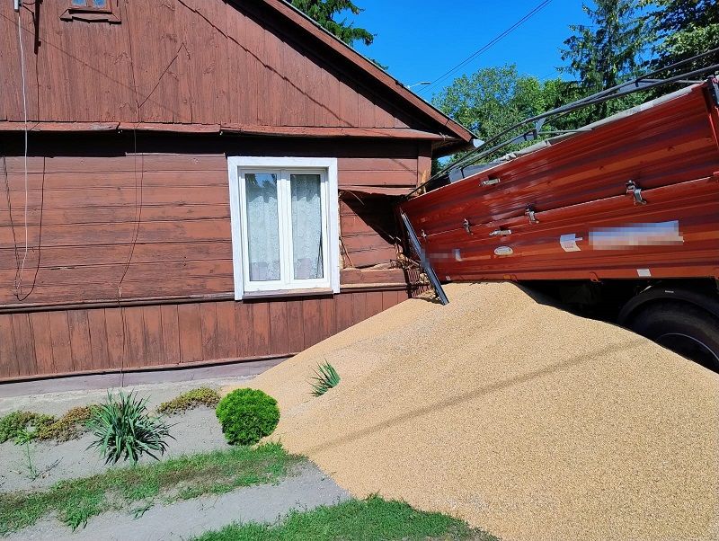 Przyczepa ze zbożem staranowała dom