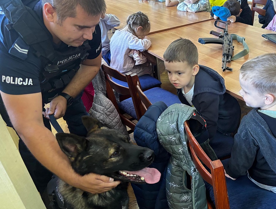 Wiele emocji wśród maluchów wzbudziło spotkanie z przewodnikiem psa służbowego st. sierż. Dawidem Jowikiem oraz „czworonożnym funkcjonariuszem” o imieniu „Tolo”. Policjant przygotował także pokaz umiejętności czworonoga. Był też czas by usiąść za kierownicą radiowozu i zrobić pamiątkowe zdjęcie.