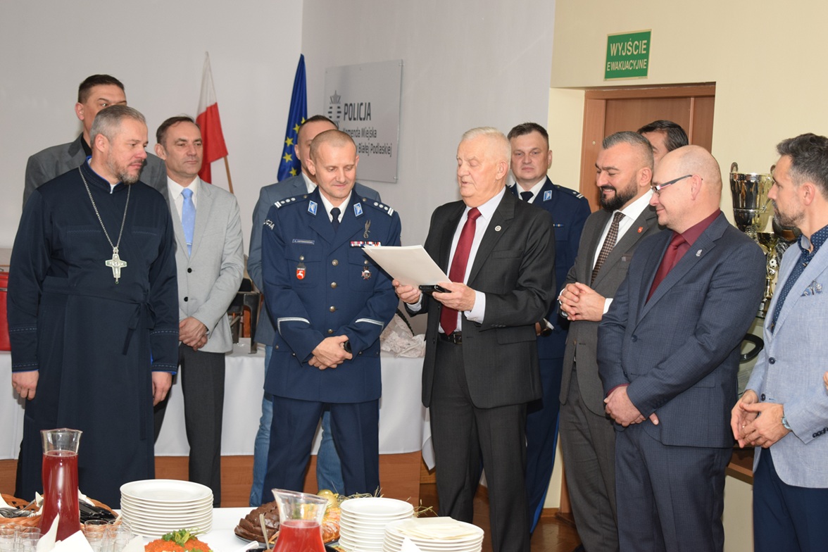 Uroczystość rozpoczęła się od powitania gości przez Komendanta Miejskiego Policji w Białej Podlaskiej inspektora Andrzeja Antoniewskiego, który podkreślił jak ważny i trudny był mijający rok, który był czasem wielu wyzwań w trosce o bezpieczeństwo mieszkańców powiatu. Podziękował za współpracę wspólne działania i pomoc lokalnych samorządów. Życzył wszystkim, by nadchodzące święta upłynęły w spokojnej i rodzinnej atmosferze.