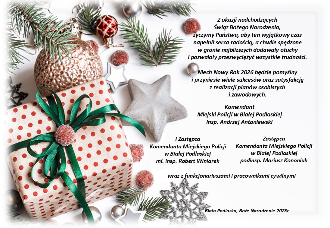 Z okazji Świąt Bożego Narodzenia inspektor Andrzej Antoniewski Komendant Miejski Policji w Białej Podlaskiej wraz z Zastępcami składają najserdeczniejsze życzenia...