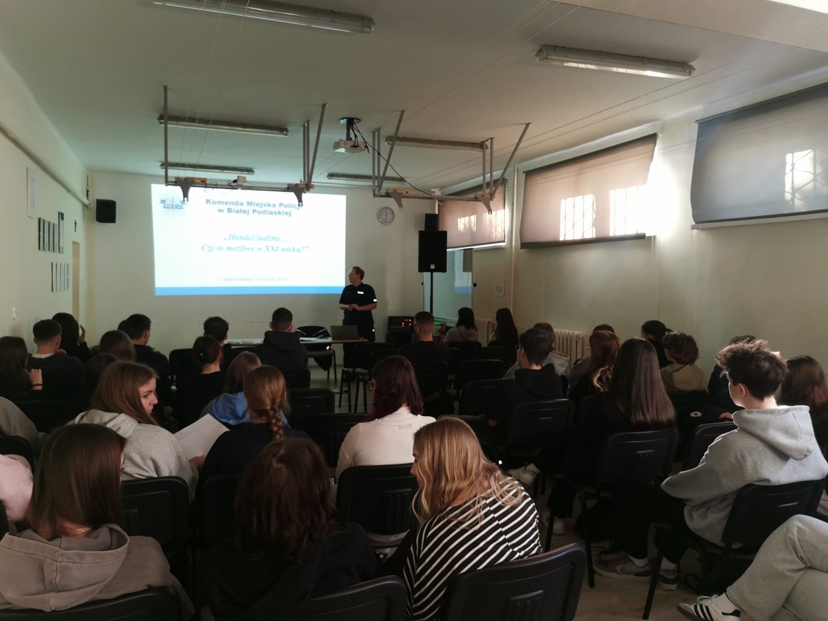 Bialska policjantka Zespołu do spraw Profilaktyki Społecznej Nieletnich i Patologii asp. szt. Sylwia Jaworowska spotkała się przed weekendem z uczniami II Liceum Ogólnokształcącego im. E. Plater w Białej Podlaskiej. Tematyką pogadanki wśród trzecioklasistów był jakże ważny temat handlu ludźmi.