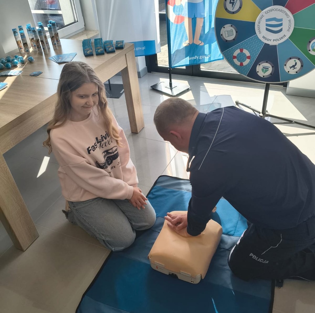 Po części teoretycznej przyszedł również czas na praktykę. Młodzież pod czujnym okiem funkcjonariusza ćwiczyła przy wykorzystaniu fantomu, zdobywając umiejętności jakże ważne w codziennym życiu.