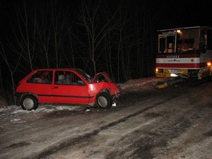 Do obu wypadków doszło w sobotę. Pierwszy miał miejsce ok. godz. 15.25 w Zabłociu. Z dotychczasowych ustaleń wynika, że kierujący samochodem osobowym m-ki Ford Fiesta, 21-letni mieszkaniec gm. Tuczna wyjeżdżając z drogi podporządkowanej wpadł w poślizg. Kierowca forda tracąc panowanie nad pojazdem wymusił pierwszeństwo przejazdu kierującemu autobusem 31-letniemu mieszkańcowi gm. Kodeń. Skutkiem zderzenia pojazdów, kierujący samochodu osobowego oraz jego pasażer, 46-letni mieszkaniec Białej Podlaskiej z obrażeniami ciała zostali przewiezieni do szpitala. Od mężczyzn pobrano krew do badań na zawartość alkoholu. Kierowca autobusu był trzeźwy.