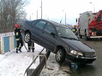 Przybyły na miejsce patrol ruchu drogowego zastał zawieszone tylnym kołem na barierce oddzielającej jezdnię od chodnika auto. Nietrudno sobie wyobrazić co mogłoby się stać, gdyby impet uderzenia był nieco większy. Kierowca nie potrzebował pomocy lekarskiej. Oświadczył, że jadąc pokryta błotem pośniegowym jezdnią utracił w pewnym momencie panowanie nad pojazdem i pomimo prób wyprowadzenia pojazdu z poślizgu nie udało mu się to i uderzył w barierkę.