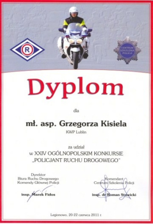 Tegoroczny finał konkursu odbył się w dniach 20-22 czerwca bieżącego roku w Centrum Szkolenia Policji w Legionowie. Mł. asp. Grzegorz Kisiel, pracujący na co dzień w bialskiej drogówce, startował w nim drugi raz z rzędu. Nasz funkcjonariusz reprezentował woj. lubelskie będąc w parze z st. sierż. Grzegorzem Pożakiem z KPP w Lubartowie. Zwyciężyć się co prawda nie udało, ale wynik osiągnięty przez Grzegorza Kisiela, szczególnie maksymalna ocena w konkurencji ręcznej regulacji ruchem na skrzyżowaniu, świadczą o wysokiej wiedzy zawodowej z zakresu ruchu drogowego i wysokich umiejętnościach indywidualnych tego policjanta.