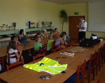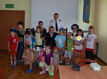 Wizyta w Komendzie Miejskiej Policji urozmaiciła wypoczynek dzieciom wypoczywającym w mieście w ramach pólkolonii. Dzieci w wieku od 6 do 10 lat posłuchały informacji o bezpiecznym wypoczynku i sposobach zachowania się w sytuacjach niebezpiecznych. Każdy z małych gości chciał przymierzyć elementy ekwipunku policyjnego, który pokazał i omówił policjant z Wydziału Prewencji. Jak zwykle przy takich odwiedzinach największą popularnością cieszyło się oglądanie radiowozu, a w nim, o dziwo, przedziału dla osób zatrzymanych.
