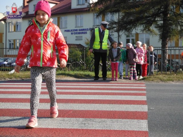 Dzisiaj rano dzieci pierwszej klasy Szkoły Podstawowej w Ciciborze Dużym pod okiem policjantów uczyły się jak prawidłowo przechodzić przez jednię. Na ruchliwym odcinku drogi przed szkołą, każde dziecko samodzielnie uczyło się, a następnie pokazywało jak prawidłowo pokonywać „zebrę”. Na zakończenie najmłodsi dostali odblaskowe opaski.