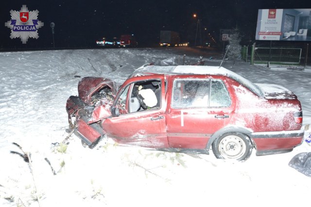 Do groźnie wyglądającego wypadku doszło w piątek wieczorem na trasie krajowej nr 2 w rejonie miejscowości Lachówka Duża. W trudnym warunkach drogowych kierowca samochodu marki VW podjął manewr wyprzedzania jednego tira, doprowadzając do zderzenia z innym ciągnikiem siodłowym jadącym z przeciwka. W wypadku ucierpiał kierowca i jego żona.