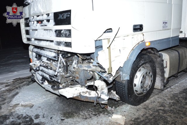 Do wypadku doszło wieczorem podczas padającego śniegu. 28-letni mieszkaniec Radzynia Podlaskiego kierujący samochodem osobowym VW, wykonując nieprawidłowo manewr wyprzedzania pojazdu ciężarowego oraz nie dostosowując prędkości jazdy do warunków panujących na drodze, zjechał na przeciwległy pas ruchu i doprowadził do czołowego zderzenia z prawidłowo jadącym samochodem ciężarowym DAF kierowanym przez obywatela Białorusi.