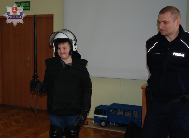 Goście policjantów dowiedzieli się wiele ciekawych rzeczy o służbie w mundurze. Poznali wyposażenia policjanta służby patrolowej i członka pododdziałów zwartych Policji. Funkcjonariusze sprawdzili podstawową wiedzę najmłodszych o bezpieczeństwie, prawidłowe odpowiedzi nagradzając drobnymi upominkami i słodyczami.