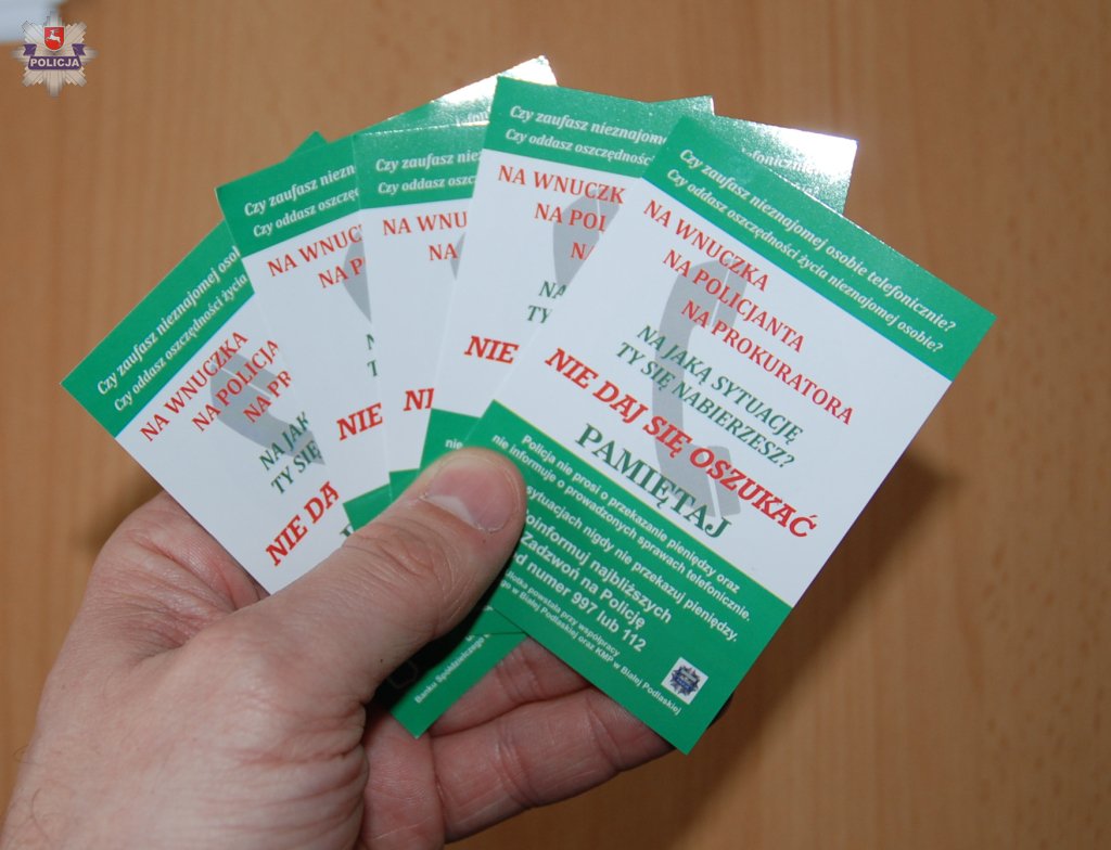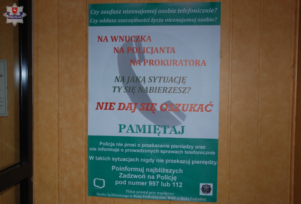 Ruszyła kolejna kampania informacyjna mająca ostrzegać przed ciągle popularnymi oszustwami „na wnuczka, czy też „na policjanta”. Tym razem w akcję zaangażował się Bank Spółdzielczy w Białej Podlaskiej i Komenda Miejska Policji. Wkrótce do osób zainteresowanych trafi kilka tysięcy ulotek ostrzegających o niebezpieczeństwach, jakie może nieść telefoniczna rozmowa ze sprytnym oszustem.