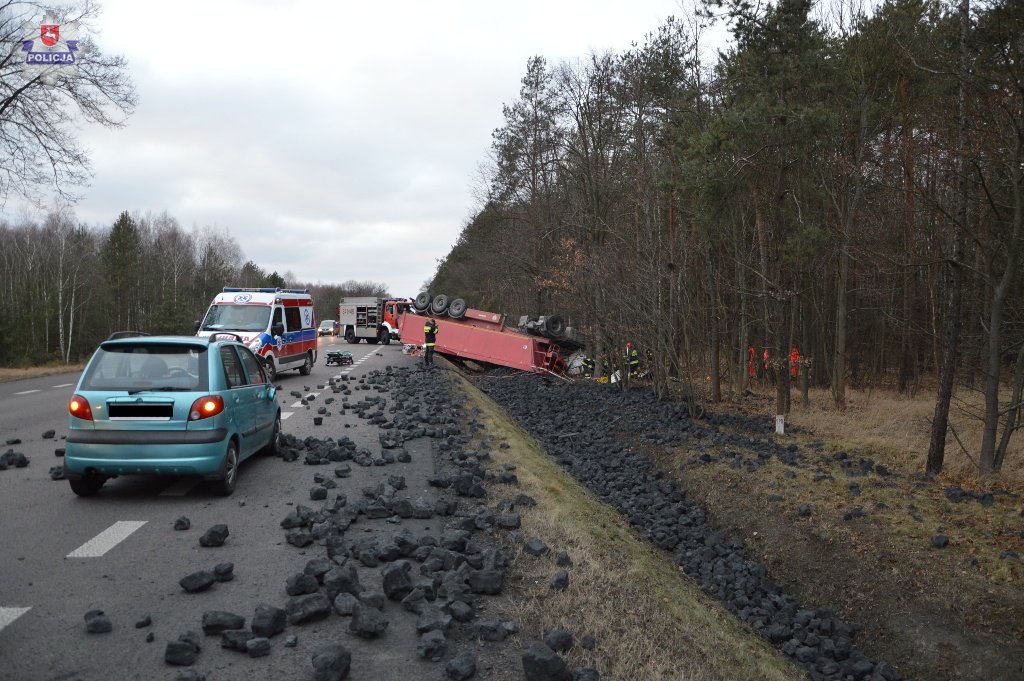 Przewożony przez ciężarówkę koks wysypał się na pobocze oraz na jezdnię. Na rozsypany na drodze ładunek najechało jadące z przeciwnego kierunku osobowe Daewoo, którym kierował mieszkaniec Białej Podlaskiej. Na szczęście mężczyzna nie ucierpiał w zdarzeniu.