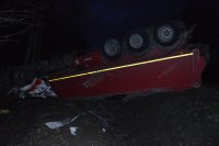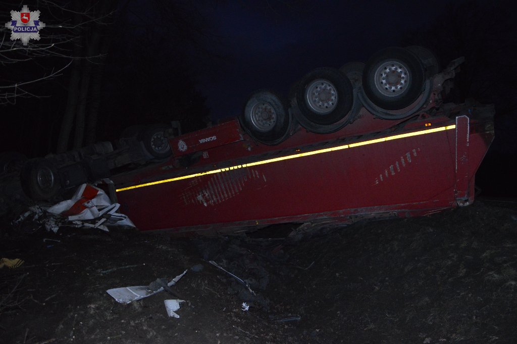 Do wypadku doszło wczoraj po 14.00 w miejscowości Styrzyniec. Kierujący samochodem ciężarowym marki Scania z naczepą 28-letni mieszkaniec powiatu lipskiego stracił panowanie nad pojazdem, w wyniku czego zjechał on na przeciwległy pas ruchu, a następnie do przydrożnego rowu, gdzie przewrócił się.