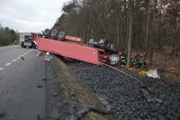 Do groźnie wyglądającego wypadku doszło wczoraj po południu na drodze krajowej numer 2. Ciężarowa Scania przewożąca koks zjechała do rowu, gdzie przewróciła się. Wysypał się z niej cały ładunek, którego część znalazła się na drodze. Czynności policjantów i strażaków na miejscu zdarzenia trwały kilka godzin.