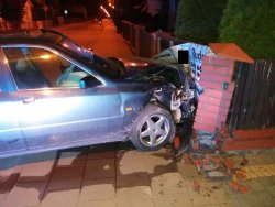 Przybyli na miejsce policjanci potwierdzili zgłoszenie i ustalili, że Lancia uderzyła w ogrodzenie z takim impetem, że zniszczyła w nim murowany słupek i dwa przęsła oraz podmurówkę, a w pojeździe uszkodzeniu uległ jego cały przód.