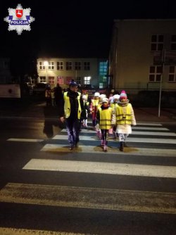 Na uczestników spotkania czekała jeszcze dodatkowa niespodzianka, tj. część praktyczna. Policjanci wraz z wychowawcami oraz wyposażonymi w kamizelki odblaskowe uczniami po godz. 20:00 wyszli w rejon oznakowanego przejścia dla pieszych. Dzieci pod czujnym okiem mundurowych, uczyły się tam, jak bezpiecznie korzystać z przejścia, drogi oraz chodnika. Maluchy świetnie poradziły sobie zarówno z teorią jak też praktyką. Jednak to część praktyczna przyniosła im najwięcej emocji. Pozostanie na długo w ich pamięci.