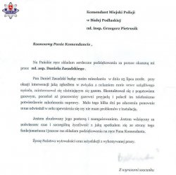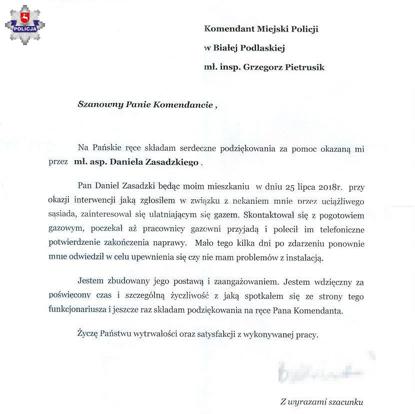„Składam serdeczne podziękowania za pomoc okazaną mi przez mł. asp. Daniela Zasadzkiego (…) Jestem zbudowany jego postawą i zaangażowaniem”- takimi między innymi słowami postawę dzielnicowego określił mieszkaniec Białej Podlaskiej, w liście który wpłynął na ręce szefa bialskich policjantów. Funkcjonariusz podczas interwencji przeprowadzonej w mieszkaniu autora listu poczuł ulatniający się gaz i natychmiast zareagował. Pomógł wywietrzyć mieszkanie oraz wezwał na miejsce właściwe służby. Dodatkowo po kilku dniach policjant powrócił pod ten adres, by upewnić się, czy wszystko jest już w porządku.
