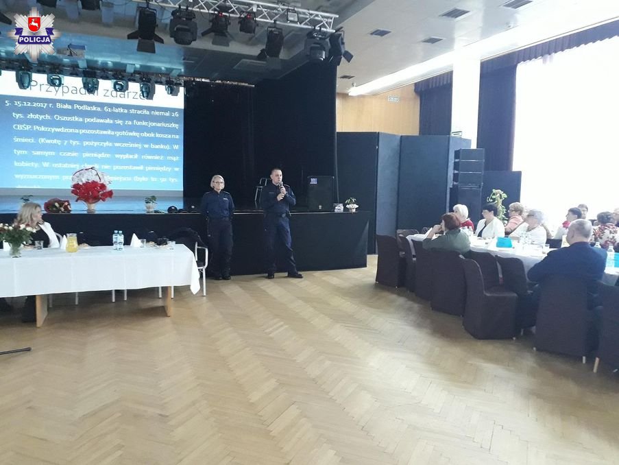 Wczoraj w sali widowiskowej Bialskiego Centrum Kultury odbył się „Dzień Seniora”. Na obchody zaproszeni zostali również policjanci bialskiej komendy. Funkcjonariusze omówili przykłady i sposoby działania sprawców oszustw „na wnuczka czy policjanta” prelekcje były też doskonalą okazją by zaprezentować spot policji lubelskiej ”Nie daj się oszukać - Oszustom Stop”. Na zakończenie spotkania funkcjonariusze wręczyli seniorom elementy odblaskowe.