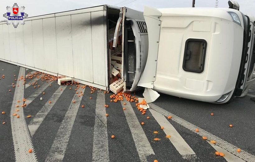 Do zdarzenia doszło przed południem na drodze K-2 w miejscowości Zalesie. Ze wstępnych ustaleń policjantów wynika, że kierująca samochodem osobowym marki Mazda 46- letnia mieszkanka gm. Zalesie, doprowadziła do zderzenia z jadącym drogą krajową samochodem ciężarowym. Kobieta prawdopodobnie nie ustąpiła pierwszeństwa przejazdu ciężarówce. W wyniku zdarzenia samochód ciężarowy przewrócił się, a na ulicę rozsypały się przewożone nim mandarynki. Samochodem ciężarowym marki Daff kierował 35-letni mieszkaniec Łukowa. Uczestnicy zdarzenia byli trzeźwi, co potwierdziło przeprowadzone przez mundurowych badanie. Policjanci ustalili, że 46-latka nie posiada uprawnień do kierowania. Na szczęście w zdarzeniu nikt nie doznał obrażeń ciała i skończyło się jedynie na uszkodzonych pojazdach.