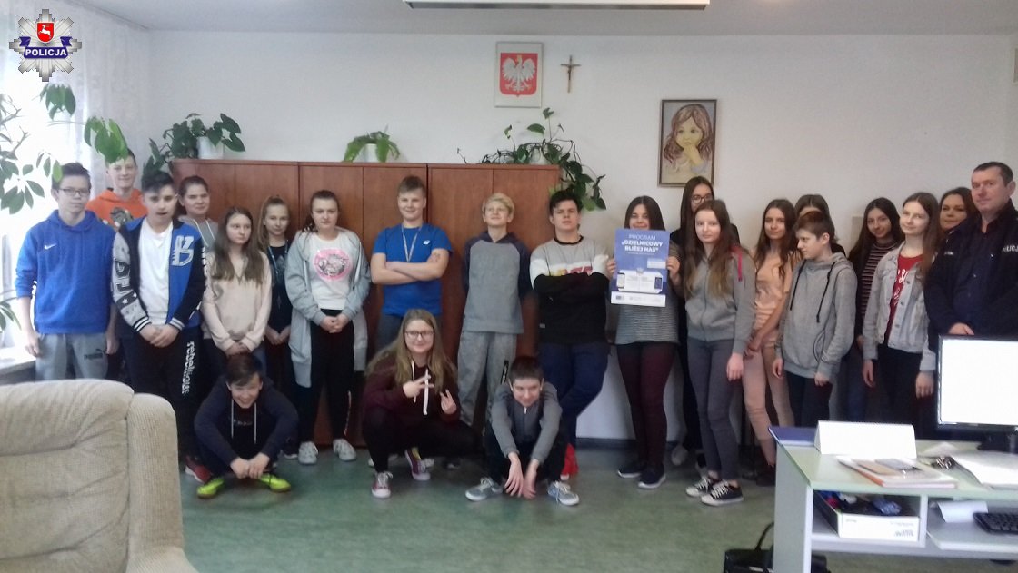 Na zakończenie spotkania policjanci zamieścili na terenie szkoły plakaty z informacją o programie „Dzielnicowy Bliżej Nas” wraz ze swoim numerem kontaktowym.