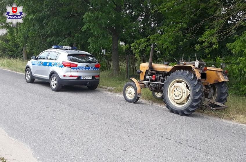 Policjanci natychmiast podjęli interwencję. W trakcie czynności mundurowi wyczuli od kobiety woń spożytego alkoholu. Badanie potwierdziło ich przypuszczenia. Wykazało ponad pół promila alkoholu w jej organizmie. Funkcjonariusze potwierdzili również, że ma zakaz kierowania pojazdami, a ciągnik którym podróżuje nie jest ubezpieczony.