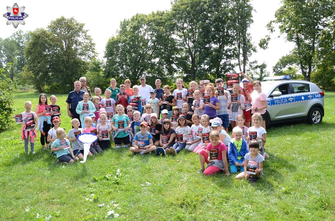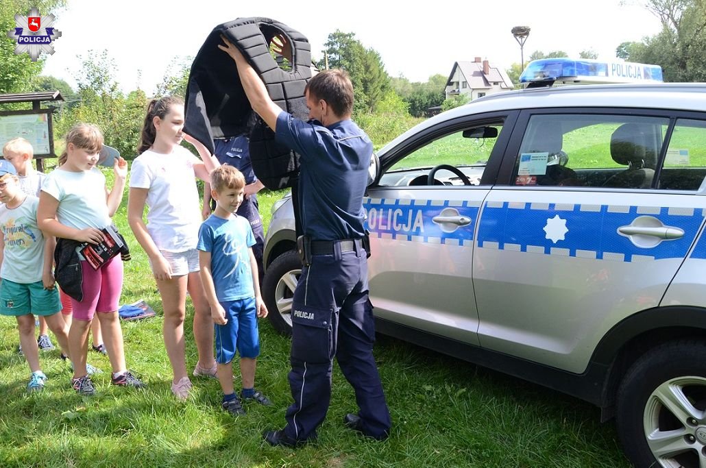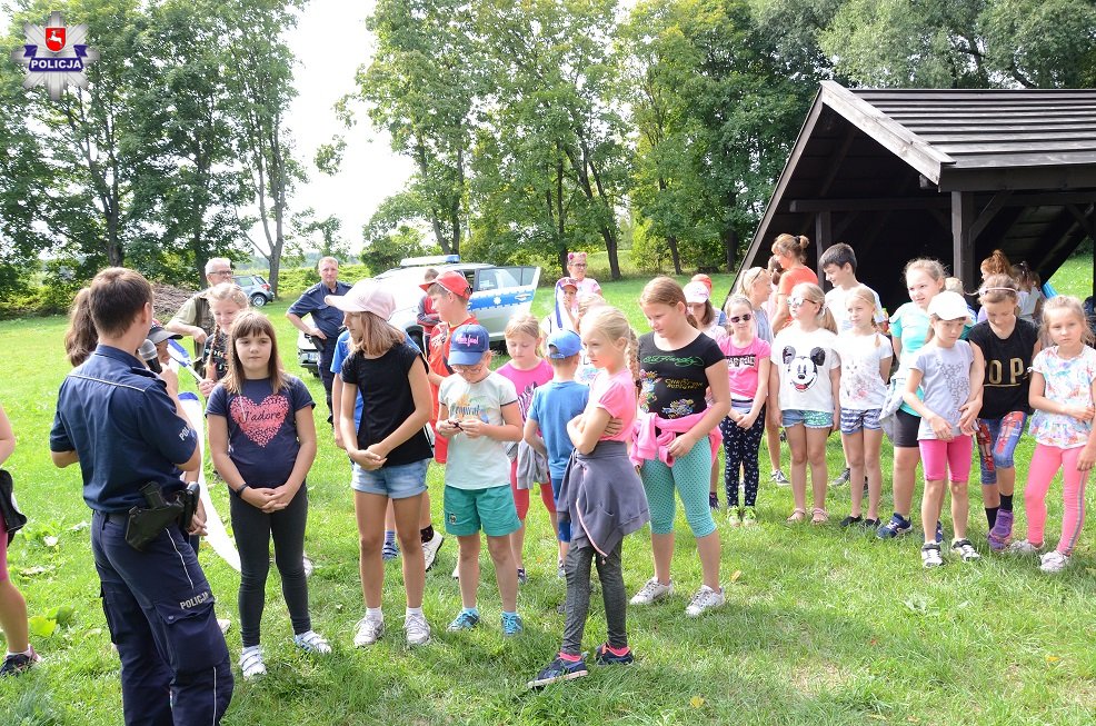 Choć tegoroczne wakacje zbliżają się już do końca, funkcjonariusze wykorzystują ten czas by spotkać się z wypoczywającymi dziećmi. Niedawno spotkanie takie odbyło się w Parku Krajobrazowym na terenie Janowa Podlaskiego. Dzielnicowi odwiedzili tam dzieci uczestniczące w zajęciach organizowanych przez Gminny Ośrodek Kultury.