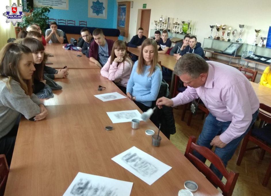 Poza wykładem odbyła się również „część praktyczna”. Na spotkanie funkcjonariusz zabrał ze sobą walizki z „policyjnymi akcesoriami”. Wyjaśnił do czego służą wszystkie przedmioty, z których korzysta się przy zabezpieczaniu śladów kryminalistycznych.