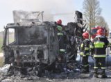 Trwa ściąganie spalonego wraku ciężarówki marki IVECO na trasie K-2 w miejscowości Kolonia Hrud. Auto wraz z ładunkiem uległo niemal całkowitemu spaleniu. Akcja ratunkowa spowodowała utrudnienia w ruchu na międzynarodowej trasie K-2.
